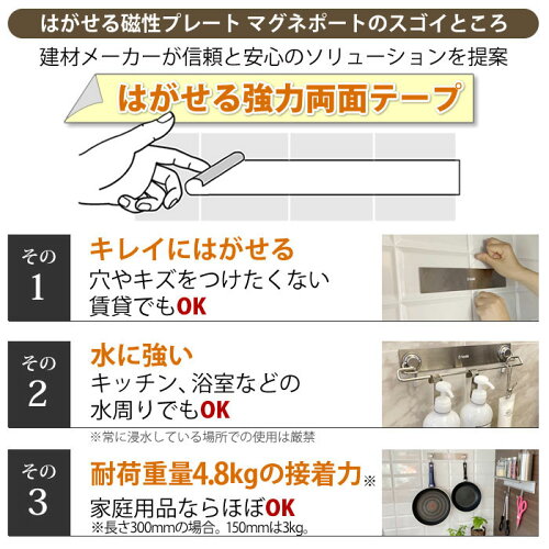 ※平滑面での加重目安は10kg(保証値ではありません) ・接着できない素材/場所: 凸凹激しい面(コンクリート・ブロックなど)、曲面、壁紙(ビニール製・布製・紙製)塗装のはがれやすい面、常時浸水している場所 <特徴> 壁に穴をあけることなく、お好みの壁にマグネポート(磁性プレート)を取り付けることができます。